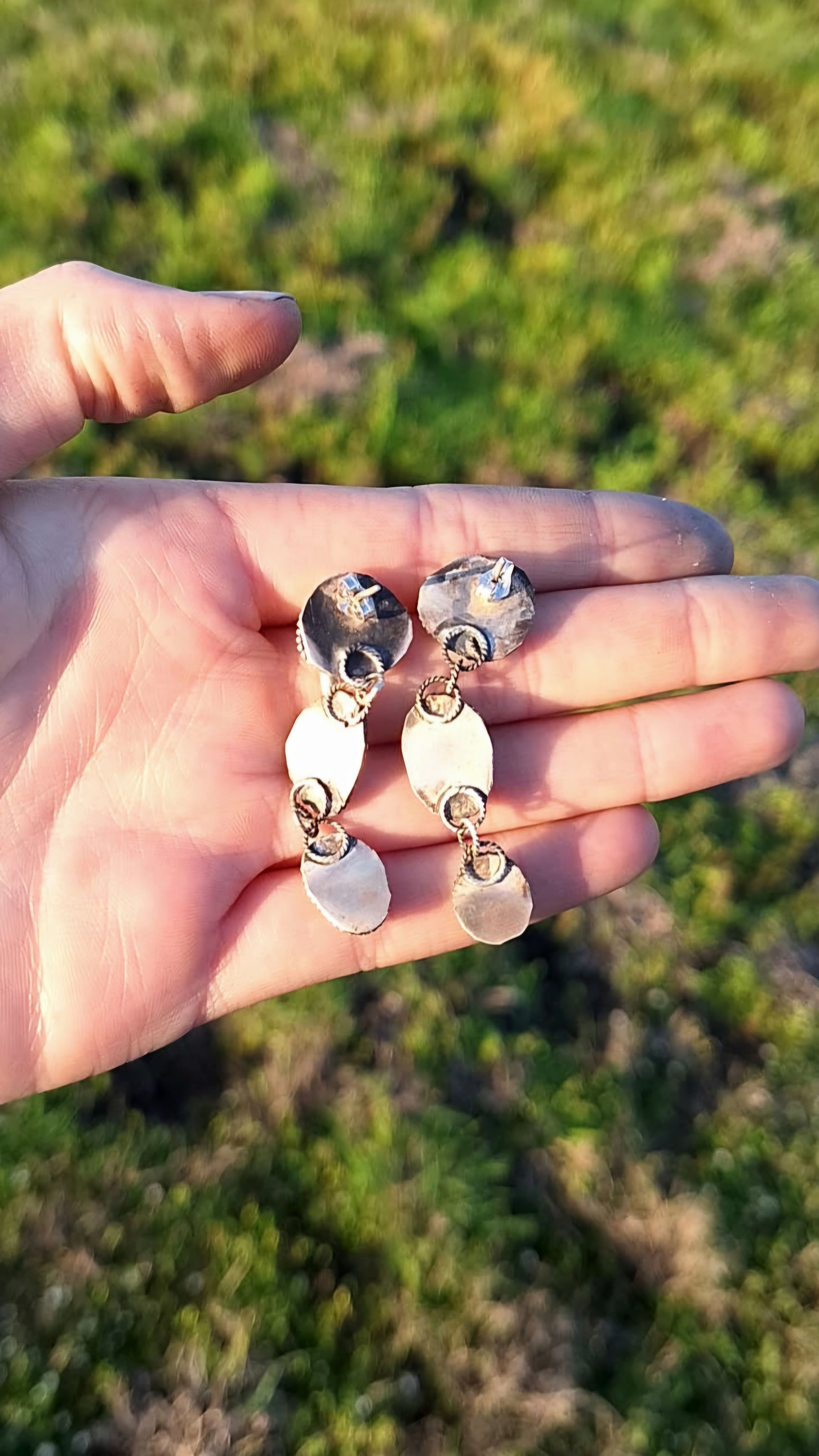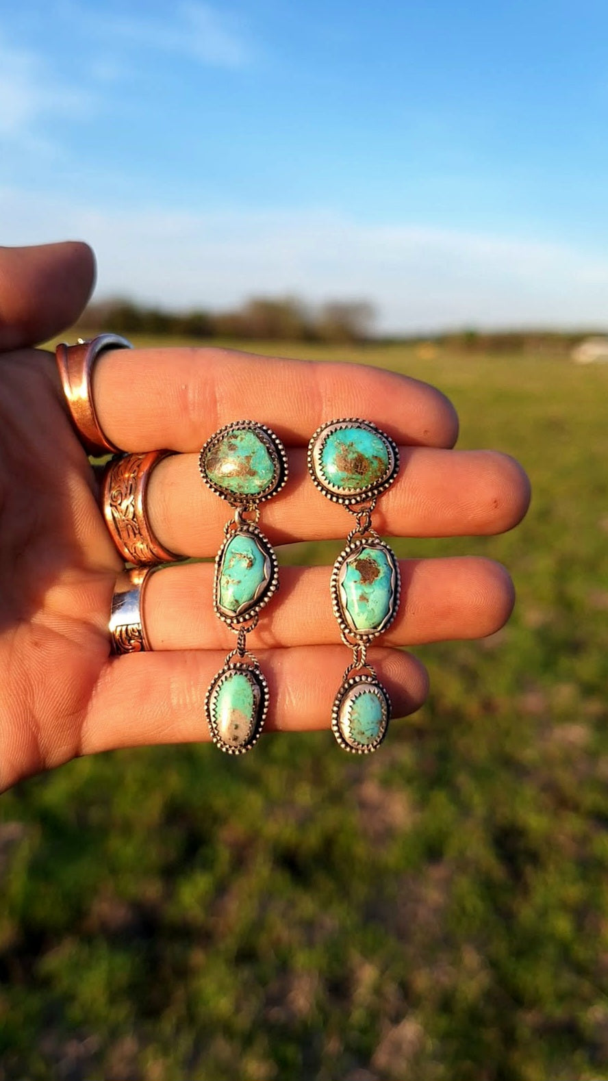 Dangle stud earrings. Mixed variety of turquoise. These measure 2" long. Post on biggest stone. Sterling and fine silver hardware.