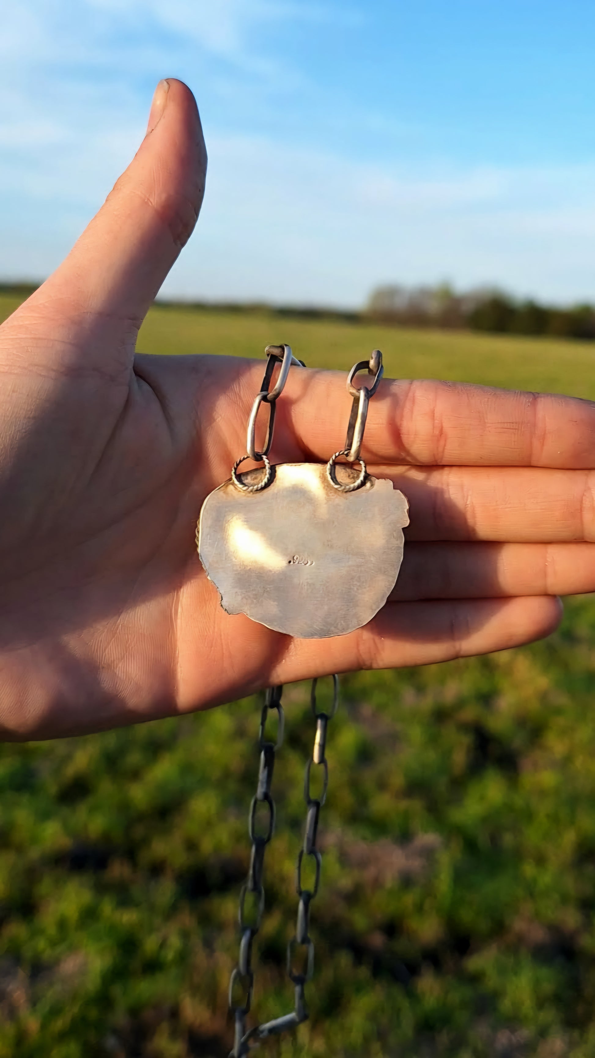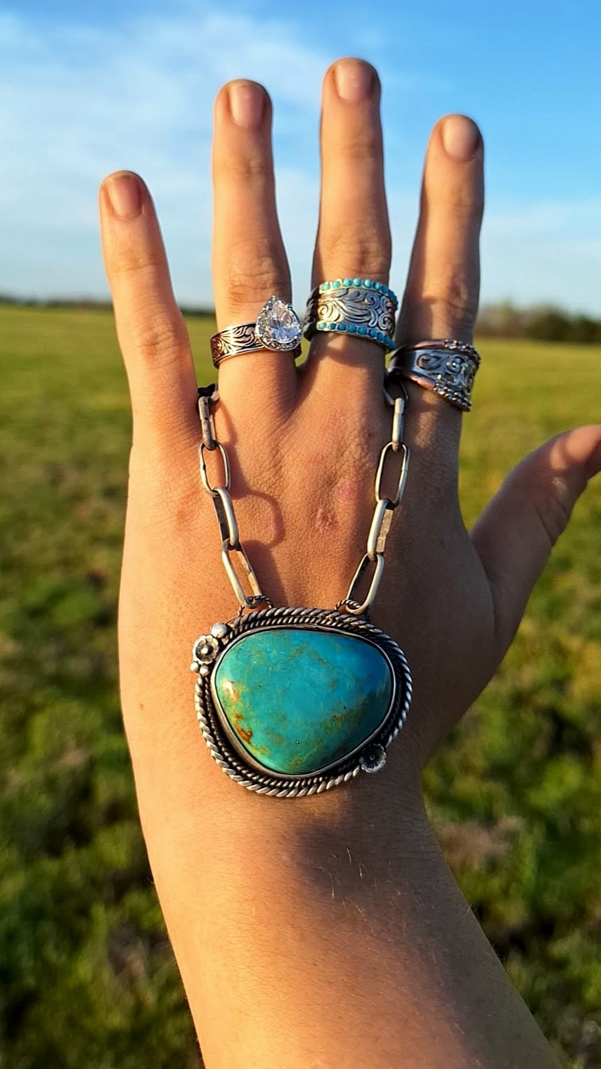 This gal is big! This necklace features a 65 carat Royston stone! Also a double rope border, flower accents, and a handmade chain! On a 16 inch HANDMADE link chain! This peice is heavy for its size. Sterling and fine silver hardware.