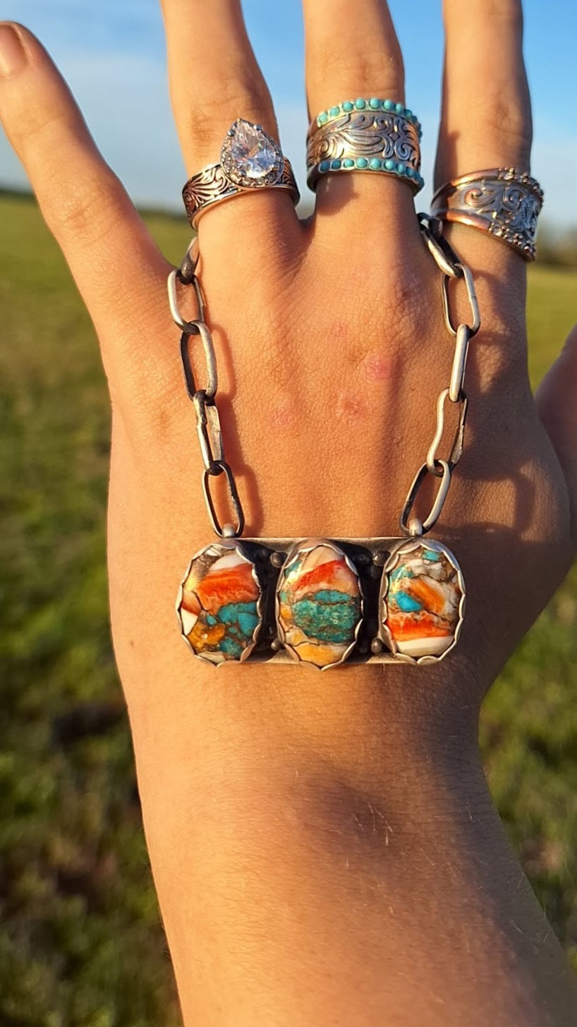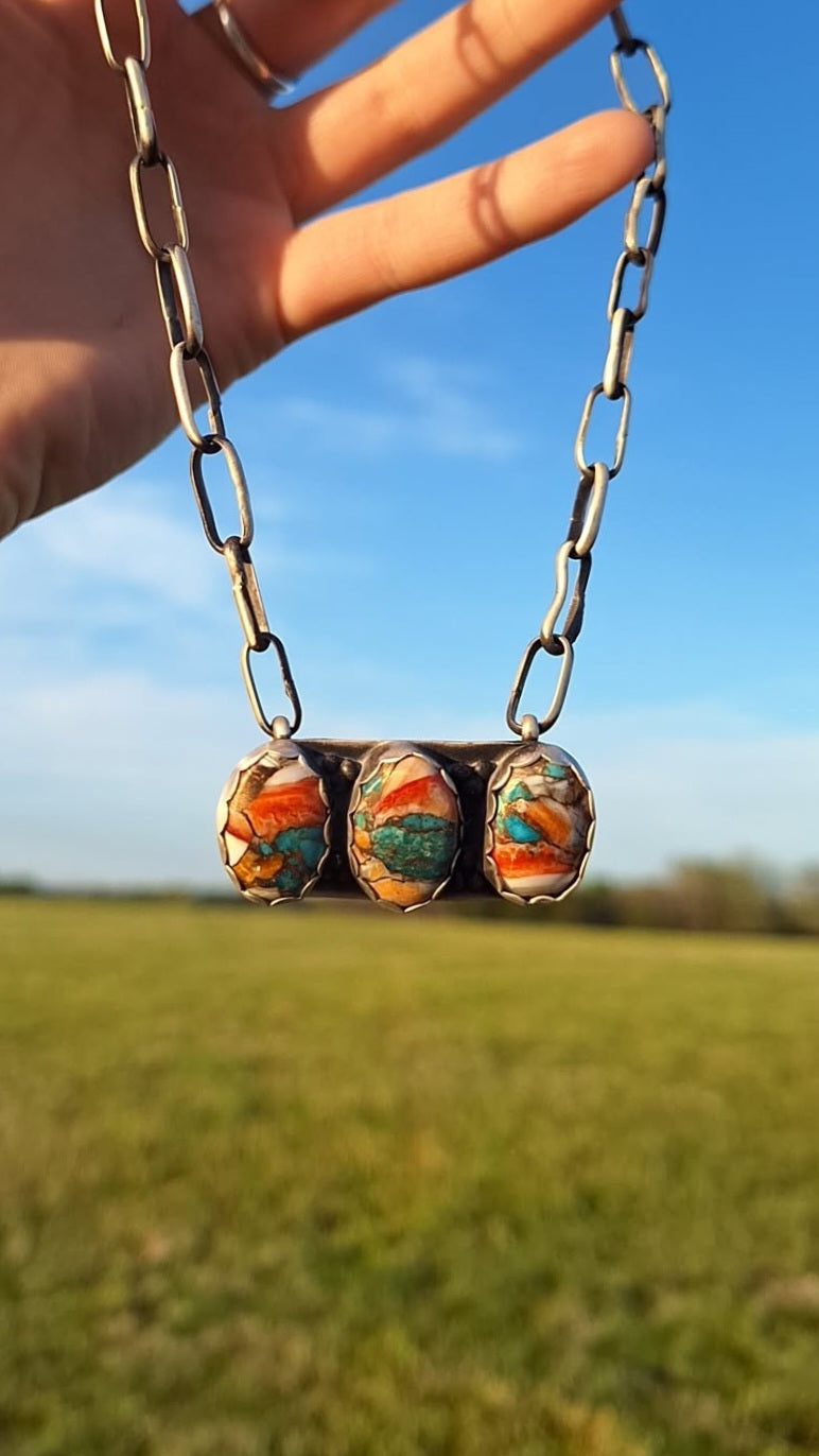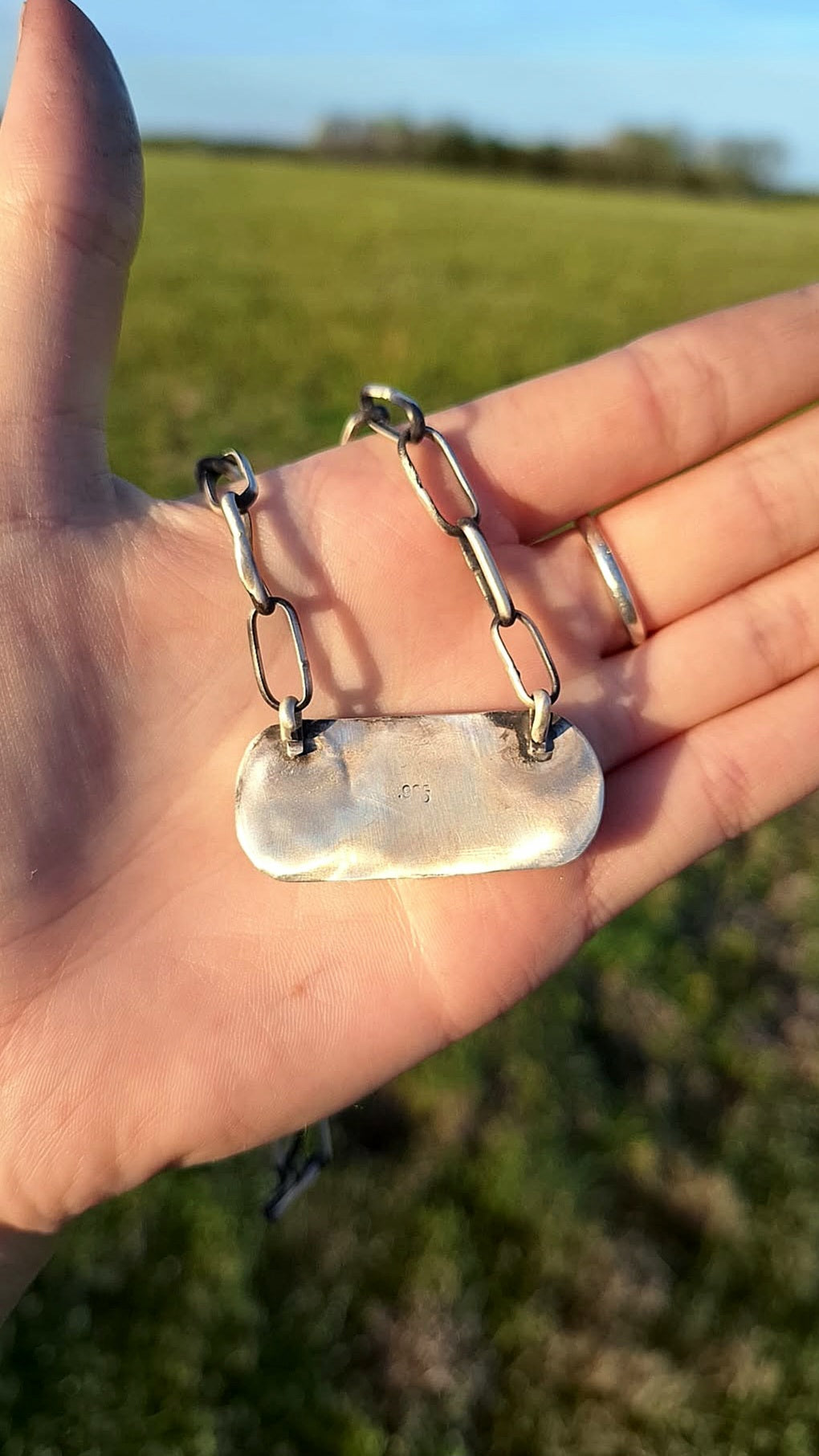 This one didn't turn out how I would've liked so it's discounted! On a handmade chain measures 14" long. Sterling and fine silver hardware. Pendant oart is 1 1/2" wide.